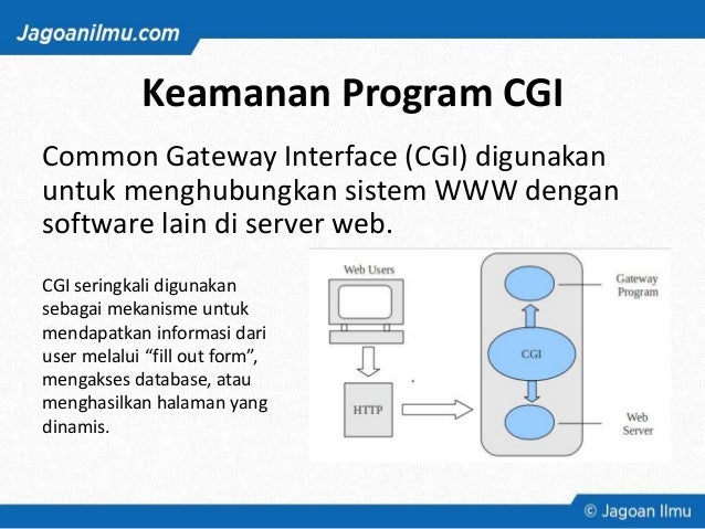 - Atau Common Gateway Interface, adalah program yang menerjemahkan data dari web server dan menampilkannya pada situs internet atau dikirim ke email. Dengan CGI halaman situs internet berinteraksi dengan aplikasi program lain. CGI melibatkan transfer data antara server dan program CGI (disebut juga script), sehingga sebuah situs internet menjadi interaktif dengan input/masukan dari pengunjungnya. Form, buku tamu, forum diskusi, pengiriman komentar dan fitur lainnya bisa dibuat dengan CGI.